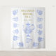 Eine schicke, schlichte, moderne, elegante und elegante Brautparty-Kulisse mit chinesischer Untermalung, die mit einem blauen Rahmen von Teebechern in periwinkelblau und einem weißen Spitzenüberlagerungsstück (das ist ein digitaler Effekt, nicht echte Spitze), der passenden Teekanne und der modernen Typografie in einer goldenen Farbe kombiniert ist. Ein elegantes, zeitloses Design, das traditionelles, formales Hochzeitsdesign mit einem trendigen Thema verbindet.
