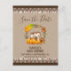 Eine Babydusche oder eine Geburtstagskarte Save the Date mit einem niedlichen Chipmunk, der hinter einigen orangefarbenen Kürbissen stehend ist. Ein Laubkranz umgibt sie mit Eichenblättern, orangefarbenen Blume und anderen Blätter. Der Hintergrund ist ein digitales Bild einer groben Papierstruktur. Oben und unten haben eine Tartangrenze mit saisonal farbenen Kreispunkten. Die Rückseite der Postkarte enthält eine Nachricht, die Sie zusammen mit Ihrem Namen und Ihrer Rücksendeadresse personalisieren können.