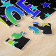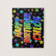 This lively and fun birthday-themed jigsaw puzzle design features the message "HAPPY BIRTHDAY, CHLOE" with the characters having a colorful rainbow spectrum inspired gradient pattern, in addition to an exciting stars background pattern. An exciting puzzle like this might be used to send birthday greetings to somebody named Chloe. [~Z0000468]