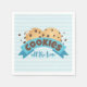 Blaue gestreifte Servietten mit einem lustigen Design von Schokoladenkeksen, die ein Paar Kekse und einen Biss aus einem von ihnen, mit Schokoladenstückchen und Krümeln überall sprühen! Bearbeitbarer Text, der "Cookies die ganze Zeit" sagt, der auch über einem gebogenen blauen Band-Design steht.