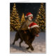 Humorous Christmas card featuring a chocolate / brown Labrador and a Partridge in an apparent truce over the Christmas period! The Partridge is riding the brown / chocolate Labrador in a snowy scene with Christmas trees twinkling in the background.