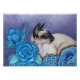 Original Aquarellmalerei von Sandra Gale, mit einem Schokoladenpoint Siamesen Katze, umgeben von blauen Blumen auf einem hellen lila Hintergrund. Blume sind blaue Hydrangea, blaue Mohn und eine blaue Rose. Das Design ist perfekt für Katzenliebhaber und diejenigen, die die siamesische Rasse besonders mögen. Ideal für Schlafzimmerwandkunst oder gerahmt mit passendem Bild. Die passende Aquarellmalerei eines Blaupunktes Siamese ist auch in meinem EverIrisPrints Shop erhältlich.