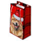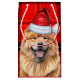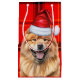 Ein niedliches Chow-Chow, das für die Saison im Hut des Weihnachtsmannes gekleidet ist, Paare mit einem roten und schwarzen Urlaub kariert, um eine wunderbare Geschenktasche für den Hundefreund zu schaffen.
