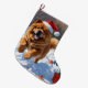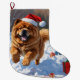 Chow Chow läuft im Schnee mit Weihnachtsmütze Großer Weihnachtsstrumpf