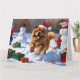 Chow Chow läuft im Schnee mit Weihnachtsmütze Karte