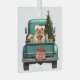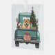 Ein aquamariner, blauer Retro-Lieferwagen-LKW trägt einen verzierten Holiday-Baum und Geschenkpakete auf diesem niedlichen Weihnachtsschmuck aus Glas. Von der Hecktür aus sieht man einen schönen roten Chow Chow Hund. Ein rustikales Holzschild auf der hinteren Stoßstange sagt "Weihnachtsmann".