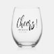 Mit diesem stemless Wine Glass, der mit einem schönen schwarzen Schriftzeichen-Design geschmückt ist, lassen Sie einen Toast elegant ausklingen. Das Wort "Cheers" ist elegant in kursiver Schrift geschrieben und fügt Ihrer Hochzeitsfeier eine Touch der Raffinesse hinzu. Personalisieren Sie dieses Glas mit den Namen des glücklichen Paares und ihrem besonderen Hochzeitsdatum, wodurch ein einzigartiger und unvergesslicher Sake für die nächsten Jahre entsteht. Fröhlichkeit für Liebe, Lachen und ein Leben voller Freude!
