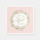 This napkin design has a wreath of pink flowers in a wreath with a pink striped background with text that says "Christ the Lord is Risen."
