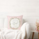 This pillow design has a wreath of pink flowers in a wreath with a pink striped background with text that says "Christ the Lord is Risen."