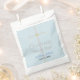 Eleganter Christening Son Danke Papier Gefälligkeitstaschen mit einfachen handgemalten Silver Cross mit Gold Akzenten. Personalisieren Sie den Namen in blauem Skript und das Datum in schwarzem Text auf einem hellblauen Hintergrund. Original Grafik und Design © TamiraZDesign.