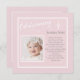Ein weich-weicher rosa Hintergrund mit weißem Rahmen hält ein Foto Ihres kleinen Mädchens. Das Wort "Taufen" wird oben in kalligrafischem Schriftart vorgedruckt. Eine elegante Einladung für Ihre Feier. Woll Geld retten? Drucken Sie es auf einfachem quadratischem Randpapier statt auf abgerundeten Ecken. Das Kreuz kann an einen beliebigen Ort gezogen, größer oder kleiner (+-) gemacht oder eliminiert werden.