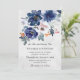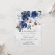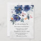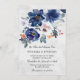 Christliche Hochzeitseinladung zeigt ein elegantes, florales Aquarellbild mit dunkelblauen und rot-rosa Rosen und roten Beeren auf hellgrauem Hintergrund. Es enthält eine inspirierende Einführung Bibel Verse Ephesians 5:31, "die beiden werden eins."
