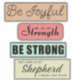 Vier inspirierende Aufkleber in einem. Sei froh, Er ist meine Stärke, Sei stark, der Herr ist mein Hirte, den ich nicht gewollt habe.