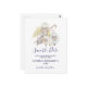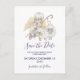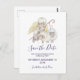 Ein christliches Thema Save the Date Postkarte. Entworfen mit einem ruhigen Engel mit gelben Flügeln, die einen Hirtenkräcker halten. Sitzen neben 2 weißen, flauschigen Lämmern. Eggshell weißer Hintergrund.