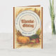 Personalisieren Sie diese Christliche Erntedank-Karte mit Ihrem Gruß und Namen, Church oder Business. Schöne Erntedank-Karte zeigt Bibel Vers aus Psalm 136, Oh danke an den Herrn! Design in den Farben Gold und Ocker, zeigt eine reiche Ernte von Gemüse und Weizen, mit einem Abendessen Teller Design.
