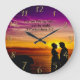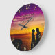 Christliche Faith-Uhr mit einer Silhouette eines jungen Paares in Liebe stehend am Meeresufer mit dem wunderschönen blauen lila und orangefarbenen und gelben Himmelslicht. und der Text Denn wir leben durch Glauben, nicht durch Sichtweise. 2 Korinther 5:7 Goldzahlen