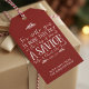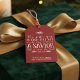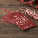 Christliche Weihnachtstyppografie Weihnachtsgeschenktags-Tags mit Luke 2:11 in festlicher Typografie auf rustikalem rotem Hintergrund, mit malerischen Schnörkeln von weißen Kiefernästen und Kiefernzapfen.