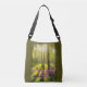 Eine über der Schulter Tasche schlecht mit einem Glaubenssatz. Das Zitat ist ermutigend. Das Foto ist ein junges Holz mit schönem Sonnenlicht, das durch die Äste strahlt. In Grün- und Brauntönen mit rosa Farbtönen.