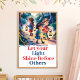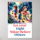Eine Aquarellbild von Kindern, die Laternen halten und bei Dämmerung durch einen Wald spazieren. Die Kinder laufen auf einem von Steinen gesäumten Weg. Der Wald ist voll von hohen Bäumen mit moosbedeckten Stämmen. Der Boden ist mit Blätter bedeckt. Der Himmel ist voll von sanften orangen und lila Farbtönen. Ein Vers "Lass dein Licht vor anderen" ist unten geschrieben.