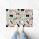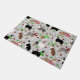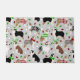 Niedliche australische Schäferhunde / Aussie Hunde in schwarz, braun und Merle-Mäntel sitzen und stehen in festlichen Outfits. Weihnachtsmannmützen, Geweihe, Pullover auf einem Urlaubshintergrund mit verstreuten Schmuckstücken.