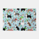 Niedliche australische Schäferhunde / Aussie Hunde in schwarz, braun und Merle-Mäntel sitzen und stehen in festlichen Outfits. Weihnachtsmannmützen, Geweihe, Pullover auf einem Urlaubshintergrund mit verstreuten Schmuckstücken.