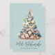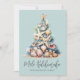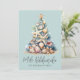 Get into the holiday spirit with this unique Christmas card featuring a Christmas tree made of shells and starfish. Perfect for sending beachy holiday wishes, this card is ideal for anyone living in tropical places like Florida, Hawaii, or the Bahamas, or for those who simply adore the beach look. The tree, topped with a starfish, is a delightful blend of blue and green hues, reminiscent of underwater coral. Set on a teal blue background with a sandy base, this card has a charming rustic watercolor style. The combination of gray fonts and script typography gives it a casual yet elegant feel. Perfect for adding a bit of surf and sand to your holiday greetings. Elegant Watercolor Christmas Tree Starfish Seashell Beach Mele Kalikimaka Holiday Card. Available as a printed card, or as a downloadable digital card that you can send by e-mail or print locally.