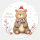 "This adorable illustration features a cheerful brown teddy bear wearing a festive red and white Santa hat and a cozy striped scarf. The bear has rosy cheeks and a soft, plush look, making it incredibly inviting. This charming graphic is perfect for children's Christmas apparel, holiday cards, ornaments, cozy blankets, or any product celebrating the sweet and simple joys of the holiday season."