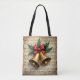 Christmas Bells with red decorative ribbon on a music sheet background.