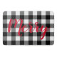 Roter "fröhlicher" Text in kalligrafischem Schriftart auf schwarz-weiß Büffel kariert. Text kann geändert werden.