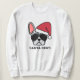 Mit diesem niedlichen Weihnachtspullover machen Sie Spaß. Das Design ist mit einem blauen, mergelfarbenen französischen Bulldoggen mit roter Weihnachtsmannmütze und einer Sonnenbrille mit dem Aufdruck "Santa Paws" versehen.