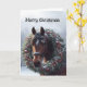 Schönes Brown Pferd in einer Weide mit einem Weihnachtskranz um den Hals. Perfekt für alle, die Liebe Pferde