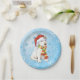 Feiern Sie die Urlaubssaison mit einem niedlichen Bull Terrier Welpe mit Weihnachtsmannmütze und Schal umgeben von Schneeflocken. Gute Ferien!
