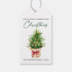 Modern Elegant Calligraphy Ink Script Have Yourself a Merry Little Christmas Gift Tag includes a Watercolor Pine Tree in a paper bag with a Red Ribbon Bow, Gold and Red Christmas Ornaments.