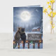 Two cats cuddle on a snowy fence decorated with festive lights, as a bright full moon illuminates the winter night and cozy cabins stand in the background