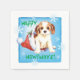 Feiern Sie die Urlaubssaison mit einem niedlichen Cavalier King Charles Spaniel Welpe sitzend in einer Weihnachtsmannmütze inmitten von Schneeflocken und den Worten, Happy Howlidays!