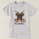 "This high-quality illustration features a detailed portrait of a noble Boxer dog with its characteristic square jaw and expressive, soft eyes. The dog is given a festive touch with small reindeer antlers adorned with golden ornaments and holly. Two beautifully wrapped Christmas presents with red ribbons sit prominently on either side. This graphic is ideal for personalized holiday gifts for Boxer owners, pet-themed Christmas cards, apparel, or home decor."