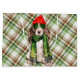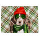 Adorable Ferien Gruß für den Hundeliebhaber, der eine Vorliebe für die Cocker Spanische Hundezüchtung hat, mit einem braunen Spaniel in grüner Sonnenbrille, einem roten Wintermützen und grünem Schal auf saisonalem kariertem gemustertem Hintergrund.