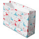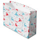 Niedliche und moderne Weihnachtsgeschenktasche mit einem Weihnachtswintermuster in Blau, Rot und Rosa auf weißem Hintergrund im schlichten nordischen Stil. Personalisieren Sie den Text einfach. Kate Eden Art