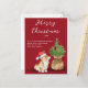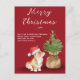 Cute dog with a Santa hat and a big bag with Christmas tree. The background is red