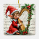 A cute Christmas sprite delicately playing a harp, set against a backdrop of beautiful sheet music.
