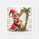 A cute Christmas sprite delicately playing a harp, set against a backdrop of beautiful sheet music