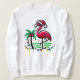 Diese festliche Abbildung zeigt einen hellrosa Flamingo mit einer Weihnachtsmannmütze, stehend in der Nähe einer Palme, die mit roten, heiligen Beeren dekoriert ist. Der Boden ist mit farbenfrohen Weihnachtsbeleuchtung geschmückt, die dem Kunstwerk ein tropisches Urlaubsthema verleiht. Das spielerische und lebendige Design verbindet Strandvibes mit Weihnachtsjubeln.