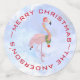 Ein niedlich rosa Flamingo mit einem Kranz um den Hals und bunten Weihnachtsbällchen über Eisuntergrund