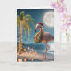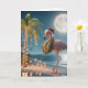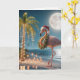 Ein festlicher Flamingo mit Weihnachtsmannmütze und Kranz steht auf einem tropischen Strand unter Vollmond. Alle Texte können geändert werden.
