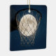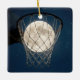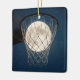 A full moon seems trapped in a basketball hoop, surrounded by its netting against a starry night sky, creating a surreal and captivating scene.