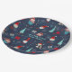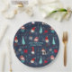 Add your family name and celebration date to these paper plates with whimsical holiday design featuring Santa cupcakes, snowmen, gift boxes, string lights, and snowflakes on a dark blue background.