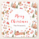 This elegant and festive coaster features a watercolor gingerbread house, gingerbread train, cake stand, cookie jar, hot cocoa, red poinsettia flowers and Christmas trees. The text combines handwritten script and sans serif fonts for a stylish and modern look. This is perfect for Christmas parties.