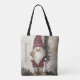 This Christmas tote bag features a whimsical gnome in a tall red hat, holding a golden star while standing in a snowy forest. With its warm palette and gentle charm, it’s a delightful alternative to a traditional Christmas stocking for kids—or a fun gift bag for anyone who appreciates classic holiday style with a touch of personality. The sample name printed along the side can be easily customized: just click “Personalize this Template” to make it truly your own. It’s a charming way to make Christmas morning feel extra special.