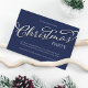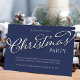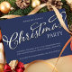 This design features a Christmas holiday calligraphy script party invitation with a plaid winter navy blue plaid simple design, a minimalist minimal modern classic, a stylish trendy typography lettering font, a Christmas holiday party get-together, a family friends corporate party invite, with a silver gradient text lettering style, a creative stylish traditional design, an elegant simplistic elegance contemporary, simple minimal Christmas party