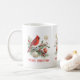 Stunning arrangement of holly, Christmas balls, and a charming red cardinal. Get into the holiday spirit with a customizable mug featuring red personalized typography.